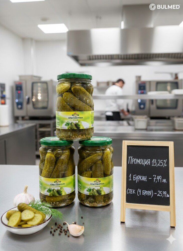 Голяма разфасовка! Кисели краставички БУЛМЕД в буркан 1.600 кг. Вземете стек от 4 бр. само за 25,99 лв. и спестете 13,25% – идеално за ресторанти и големи семейства.